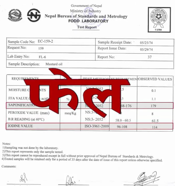 नेपाल खाद्य तथा गुण नियन्त्रण विभागकै ल्याबमा टेष्ट गर्दा उक्त तेल गुणस्तरमा फेल भएको प्रमाणित भएको हो । उक्त ल्याबमा तेल परिक्षण गर्दा SAPONIFACATION को मात्रा १६८ देखि १७६ हुनुपर्नेमा १७९ भएको पाइएको छ । यस्तै PEROXIDE VALUE ५८ देखि ६००५ हुनुपर्नेमा ६१. भएको पाइएको छ । यस्तै आयोडिन भ्यालु ९६ देखि १०८ हुनुपर्नेमा ११४ भएको पाइएको छ । यसको ठाडो अर्थ यो तेल खान लायक छैन भन्ने हो । यहाँ उल्लेख गरिएका तत्वहरु हुनुपर्ने भन्दा बढी भएको तेल गुणस्तरहीन, र स्वास्थ्यमा प्रतिकुल असर गर्ने तेल हो । यस्ता तेलले पाचन प्रक्रियामा असर गर्ने, छाला विगार्ने, सुन्दरतामा ह्रास आउने, अल्छीपना बढ्ने, र क्यान्सरसम्म हुन सक्ने चिकित्सकहरु बताउँछन् ।