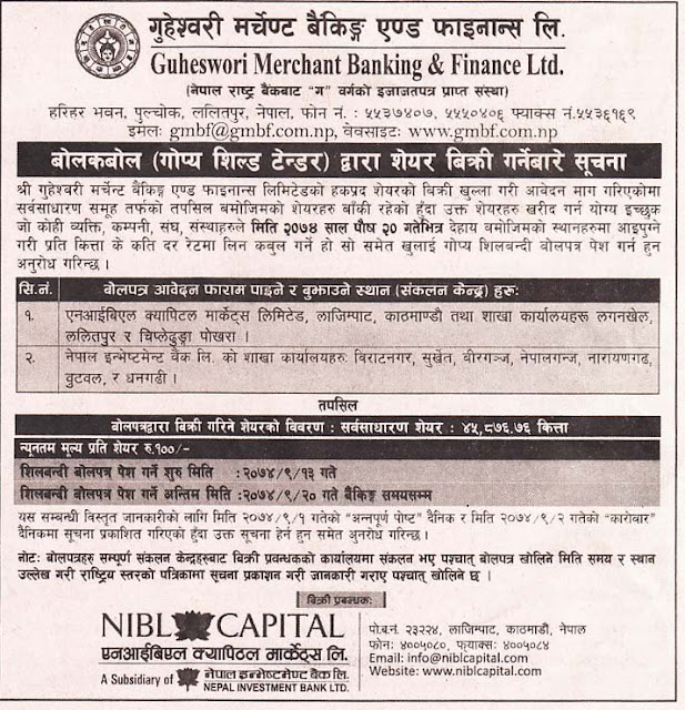 गुहेश्वरी मर्चेण्ट बैकिंग एण्ड फाइनान्स लिमिटेडको बोलकबोल द्धारा शेयर बिक्री अर्थ सरोकार १२ पुष २०७४, बुधबार पढ्न लाग्ने समय: १ मिनेटभन्दा कम ENG छुटाउनु भयो कि ? ‘यौन दुर्व्यवहार’को जाहेरी परेर थुनिएका कार्कीलाई एनआईसी एशियाले अझै हटाएन