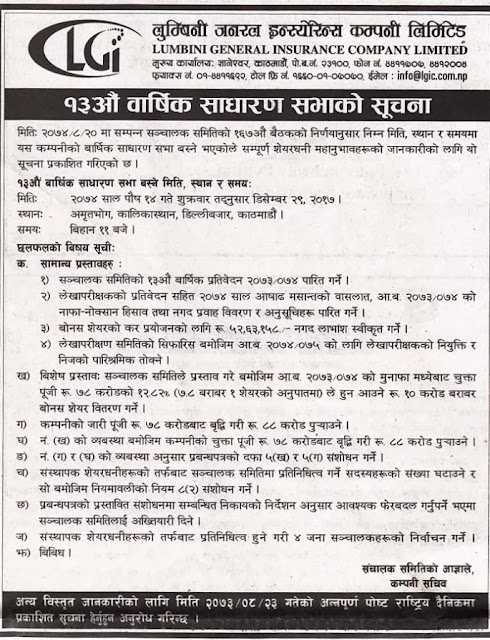 लुम्बिनी जनरल इन्स्योरेन्स कम्पनी लिमिटेडको १३ औं वार्षिक साधारण सभा अर्थ सरोकार ९ पुष २०७४, आईतवार पढ्न लाग्ने समय: १ मिनेटभन्दा कम ENG छुटाउनु भयो कि ? ‘यौन दुर्व्यवहार’को जाहेरी परेर थुनिएका कार्कीलाई एनआईसी एशियाले अझै हटाएन
