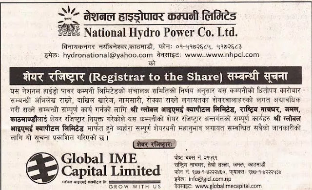 नेशनल हाइड्रोपावर कम्पनी लिमिटेडको शेयर रजिष्ट्रार अर्थ सरोकार ४ पुष २०७४, मंगलवार पढ्न लाग्ने समय: १ मिनेटभन्दा कम ENG छुटाउनु भयो कि ? ‘यौन दुर्व्यवहार’को जाहेरी परेर थुनिएका कार्कीलाई एनआईसी एशियाले अझै हटाएन