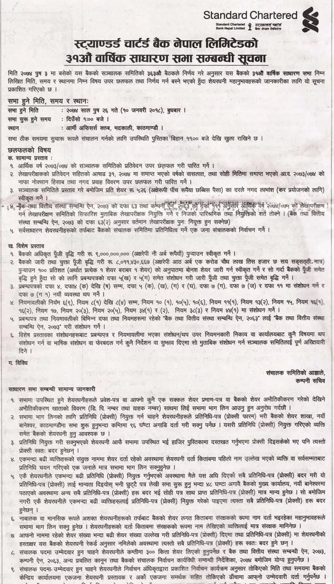 स्ट्याण्डर्ड चार्टर्ड बैंक नेपाल लिमिटेडको ३१ औं वार्षिक साधारण सभा अर्थ सरोकार ५ पुष २०७४, बुधबार पढ्न लाग्ने समय: १ मिनेटभन्दा कम ENG छुटाउनु भयो कि ? ‘यौन दुर्व्यवहार’को जाहेरी परेर थुनिएका कार्कीलाई एनआईसी एशियाले अझै हटाएन