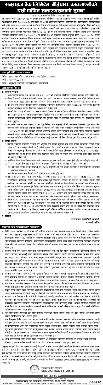 सनराइज बैंक लिमिटेडको बार्षिक साधारण सभा सम्बन्धी सुचना ! अर्थ सरोकार २७ मंसिर २०७४, बुधबार पढ्न लाग्ने समय: १ मिनेटभन्दा कम ENG सनराइज बैंक लिमिटेडको बार्षिक साधारण सभा सम्बन्धी सुचना ! छुटाउनु भयो कि ? ‘यौन दुर्व्यवहार’को जाहेरी परेर थुनिएका कार्कीलाई एनआईसी एशियाले अझै हटाएन