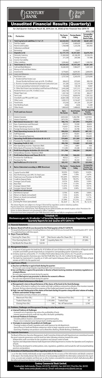 सेन्चुरी बैंकको आ. व. ०७४/७५ को दोश्रो त्रैमास रिपोर्ट अर्थ सरोकार १४ माघ २०७४, आईतवार पढ्न लाग्ने समय: १ मिनेटभन्दा कम ENG छुटाउनु भयो कि ? ‘यौन दुर्व्यवहार’को जाहेरी परेर थुनिएका कार्कीलाई एनआईसी एशियाले अझै हटाएन
