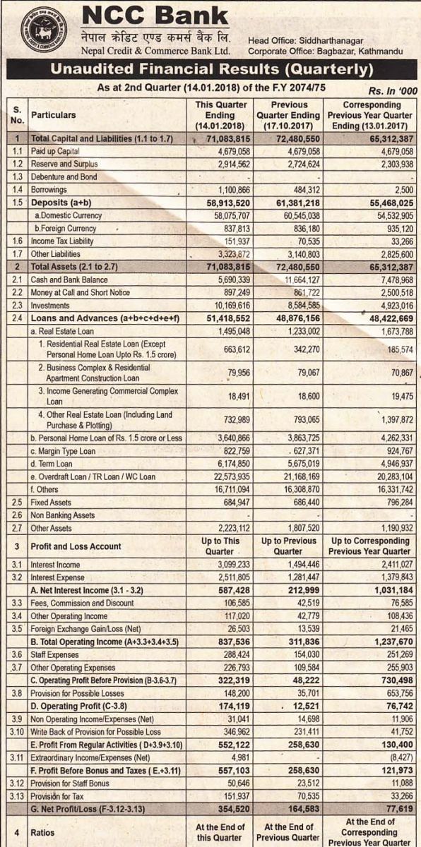 नेपाल क्रेडिट एण्ड कमर्स बैंक लिमिटेडको नाफा ३५ करोड ४५ लाख आ. व. ०७४/७५ को दोश्रो त्रैमास अर्थ सरोकार १५ माघ २०७४, सोमबार पढ्न लाग्ने समय: १ मिनेटभन्दा कम ENG छुटाउनु भयो कि ? ‘यौन दुर्व्यवहार’को जाहेरी परेर थुनिएका कार्कीलाई एनआईसी एशियाले अझै हटाएन