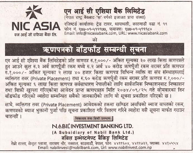 एन आई सी एशिया बैंक लिमिटेडको ऋणपत्र बाँडफाँड अर्थ सरोकार २७ पुष २०७४, बिहीबार पढ्न लाग्ने समय: १ मिनेटभन्दा कम ENG छुटाउनु भयो कि ? ‘यौन दुर्व्यवहार’को जाहेरी परेर थुनिएका कार्कीलाई एनआईसी एशियाले अझै हटाएन