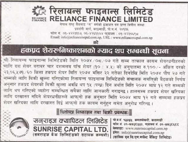 रिलायन्स फाइनान्स लिमिटेड को हकप्रद शेयर निष्काशन म्याद थप अर्थ सरोकार २७ पुष २०७४, बिहीबार पढ्न लाग्ने समय: १ मिनेटभन्दा कम ENG छुटाउनु भयो कि ? ‘यौन दुर्व्यवहार’को जाहेरी परेर थुनिएका कार्कीलाई एनआईसी एशियाले अझै हटाएन