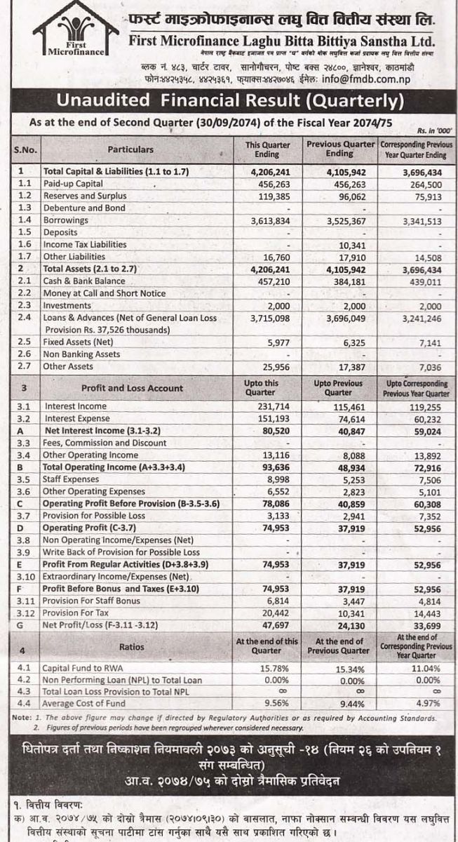 फस्र्ट माइक्रोफाइनान्स लघुवित्त वित्तीय सं. लि.को दोस्रो त्रैमासको रिपोर्ट सार्वजनिक अर्थ सरोकार २ माघ २०७४, मंगलवार पढ्न लाग्ने समय: १ मिनेटभन्दा कम ENG छुटाउनु भयो कि ? ‘यौन दुर्व्यवहार’को जाहेरी परेर थुनिएका कार्कीलाई एनआईसी एशियाले अझै हटाएन