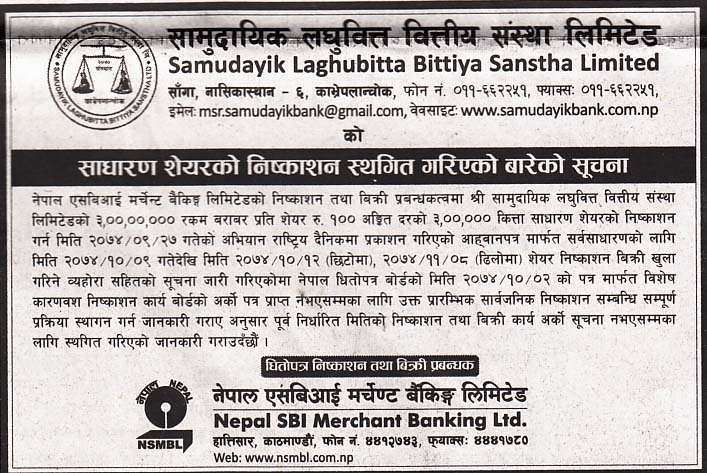 सामुदायिक लघुवित्त वित्तीय सं. लि. को साधारण शेयर निष्काशन स्थगित अर्थ सरोकार ८ माघ २०७४, सोमबार पढ्न लाग्ने समय: १ मिनेटभन्दा कम ENG छुटाउनु भयो कि ? ‘यौन दुर्व्यवहार’को जाहेरी परेर थुनिएका कार्कीलाई एनआईसी एशियाले अझै हटाएन