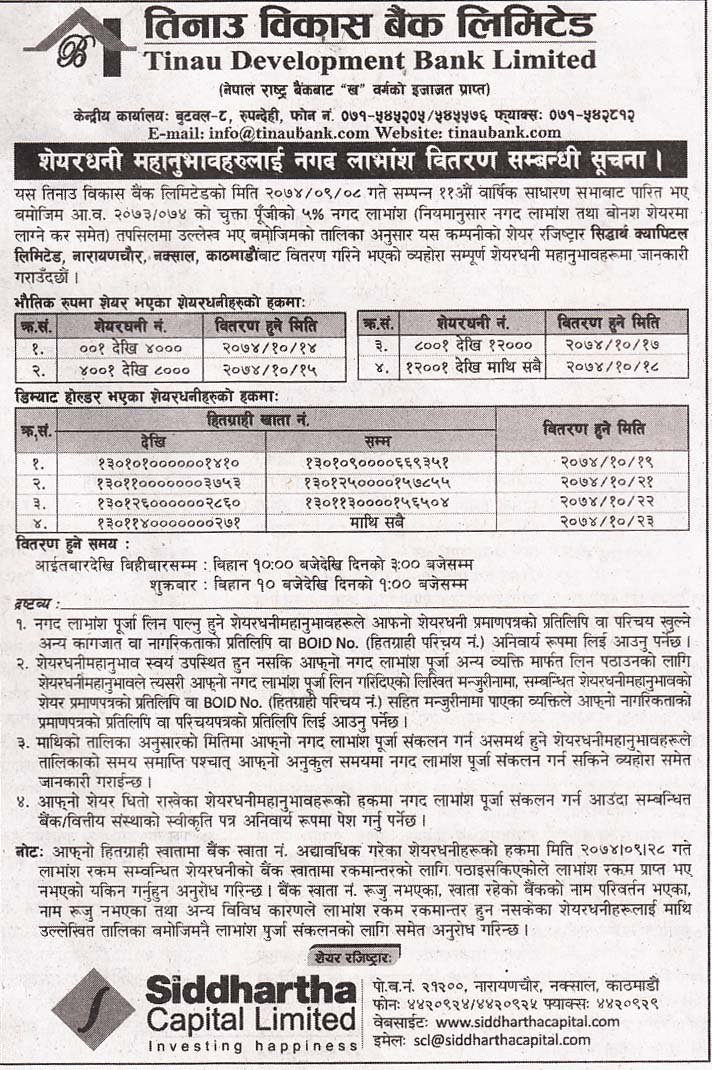तिनाउ विकास बैंक लिमिटेडको शेयरधनीलाई नगद लाभांश वितरण अर्थ सरोकार १४ माघ २०७४, आईतवार पढ्न लाग्ने समय: १ मिनेटभन्दा कम ENG छुटाउनु भयो कि ? ‘यौन दुर्व्यवहार’को जाहेरी परेर थुनिएका कार्कीलाई एनआईसी एशियाले अझै हटाएन