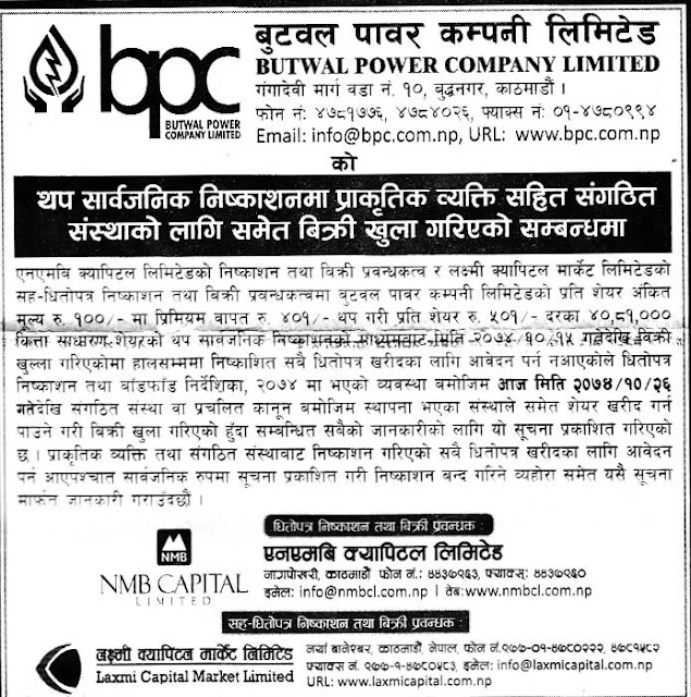 बुटवल पावर कं.लि.को सार्वजनिक निष्काशनमा प्राकृतिक व्यक्ति सहित संगठित संस्थाको लागि बिक्री खुल्ला गरिएको सम्बन्धमा अर्थ सरोकार २६ माघ २०७४, शुक्रबार पढ्न लाग्ने समय: १ मिनेटभन्दा कम ENG छुटाउनु भयो कि ? ‘यौन दुर्व्यवहार’को जाहेरी परेर थुनिएका कार्कीलाई एनआईसी एशियाले अझै हटाएन