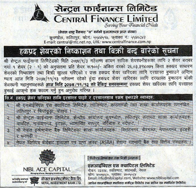 सेन्ट्रल फाइनान्स लि. को हकप्रद शेयर निष्काशन बिक्री बन्द अर्थ सरोकार १३ फाल्गुन २०७४, आईतवार पढ्न लाग्ने समय: १ मिनेटभन्दा कम ENG छुटाउनु भयो कि ? ‘यौन दुर्व्यवहार’को जाहेरी परेर थुनिएका कार्कीलाई एनआईसी एशियाले अझै हटाएन