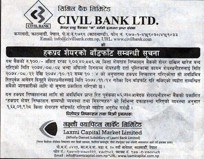 सिभिल बैंक लिमिटेडको हकप्रद शेयर बाँडफाँड