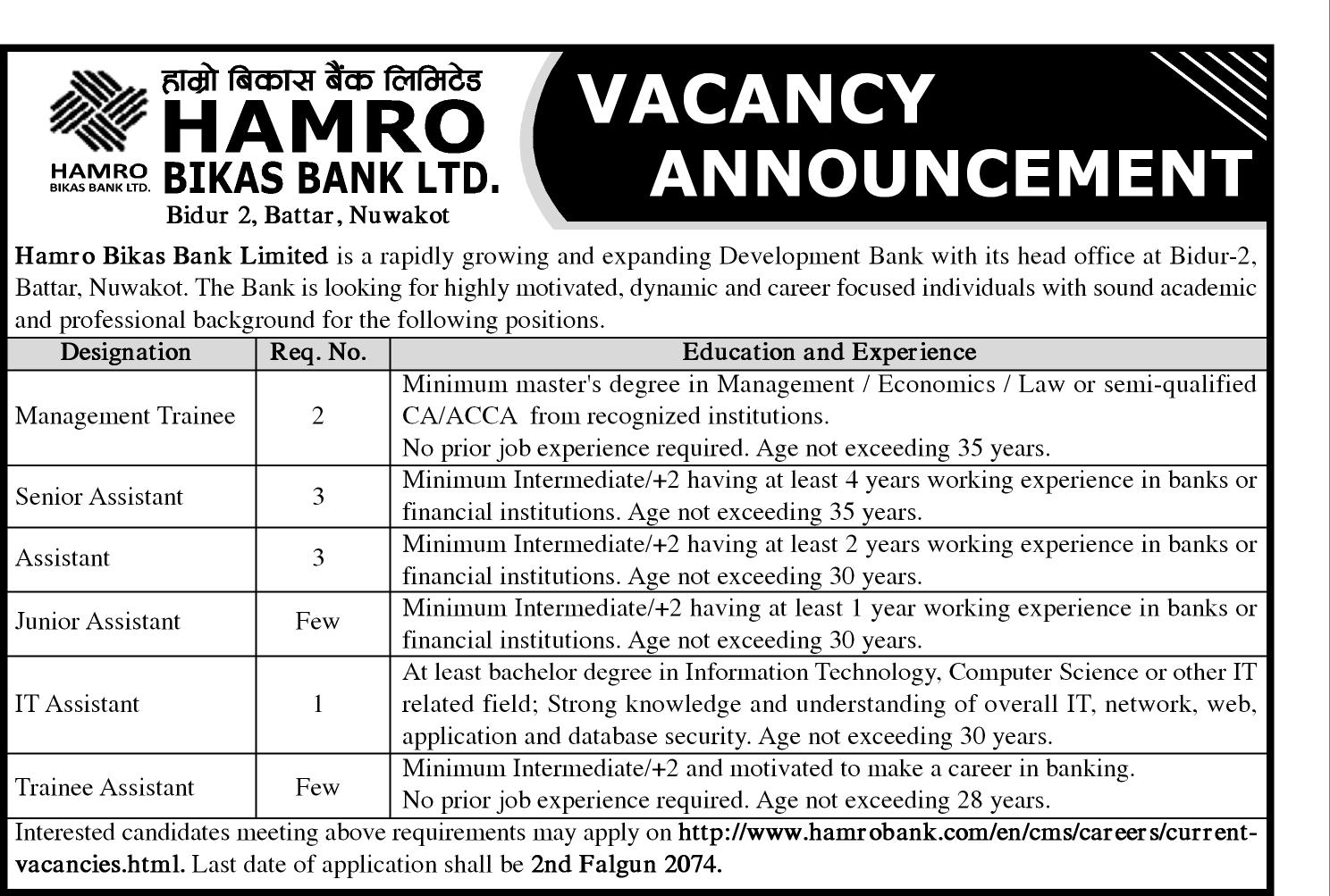 काठमाडौँ- हाम्रो बिकास बैंकमा जागिर खुलेको छ । बैंकले एक सुचना जारी गर्दै विभिन्न पदमा भ्याकेन्सी खुलाएको हो । बैंकको भ्याकेन्सीको पूर्ण विवरण यसप्रकार छ :