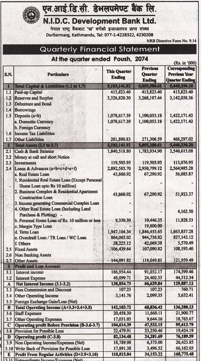 एन. आई. डि. सी. डेभलपमेन्ट बैंक लि.को नाफा ७ करोड ७८ लाख आ. व. ०७४/७५ को दोश्रो त्रैमास अर्थ सरोकार १८ माघ २०७४, बिहीबार पढ्न लाग्ने समय: १ मिनेटभन्दा कम ENG छुटाउनु भयो कि ? ‘यौन दुर्व्यवहार’को जाहेरी परेर थुनिएका कार्कीलाई एनआईसी एशियाले अझै हटाएन