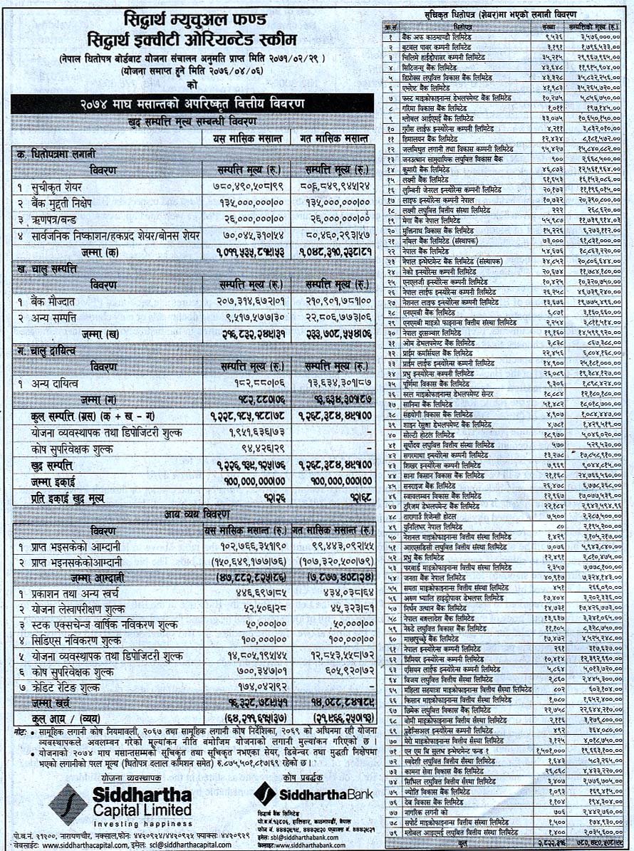 सिद्धार्थ इक्वीटी ओरियन्टेड स्कीम को ०७४ माघ मसान्तको अपरिकृष्त वित्तीय विवरण अर्थ सरोकार ११ फाल्गुन २०७४, शुक्रबार पढ्न लाग्ने समय: १ मिनेटभन्दा कम ENG छुटाउनु भयो कि ? ‘यौन दुर्व्यवहार’को जाहेरी परेर थुनिएका कार्कीलाई एनआईसी एशियाले अझै हटाएन