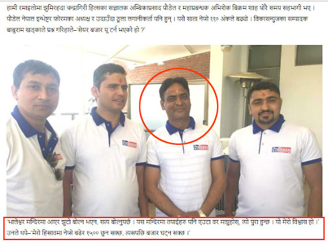 काठमाडौँ- चन्द्रागिरी हिल्स लिमिटेडमा पुगेका बिकास मिडियाका पत्रकार साथीहरुसँगको कुराकानीमा इन्भेष्टर्स फोरमका अध्यक्ष अम्बिका पौडेलले बजार १५०० सम्म पुग्न सक्ने र तल झार्न सक्ने बताए भनी उक्त सञ्चारगृहबाट सञ्चालन हुने बिकासन्यूज डटकमले समाचार छाप्यो । आर्थिक पत्रकारितामा आफ्नो फरक र छुट्टै पहिचान बनाउन सफल भएको र बजारमा अधिकांसले राम्रो मान्ने पत्रकार सम्पादक रहनुभएको बिकासन्यूज डटकमले अम्बिका पौडेलले त्यसो नभनी समाचार लेख्यो भन्ने कुरा हामी पत्रकारलेमात्र होइन आम जनताले पत्याउने कुरा भएन । उक्त अनलाइनले आफ्नो विश्वसनीयताको छाप पनि बनाएको छ । त्यसैले पौडेलले त्यसो नभनी मिडियाले कुरा बंग्यायो कि भन्ने प्रश्न उठाउने ठाउँ कम छ ।