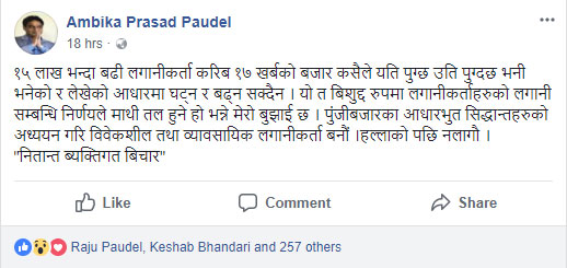 हुन पनि अम्बिका पौडेलले भने भनेपछि पत्याउने धेरै छन् । बजार घटेर आफ्नो पोर्टफोलियोमा अलिकति असर गर्नेबित्तिकै नेपालमा पूँजी बजारमा भएभरका सबै समस्या समाधानको माग गर्दै आन्दोलनको धम्की दिने उनी बजार अलिकति बढ्न थालेपछी चुप भएका थिए । केहि समय अगाडी मिडियालाई बजार १५०० सम्म पुग्छ भनेका उनले आफुले बजार बढेका बेला सेयर बेचेपछी फेरि फेसबुकमा स्ट्याटस लेखे, ‘१५ लाख भन्दा बढी लगानीकर्ता करिब १७ खर्बको बजार कसैले यति पुग्छ उति पुग्दछ भनी भनेको र लेखेको आधारमा घट्न र बढ्न सक्दैन । यो त बिशुद्द रुपमा लगानीकर्ताहरुको लगानी सम्बन्धि निर्णयले माथी तल हुने हो भन्ने मेरो बुझाई छ । पुंजीबजारका आधारभुत सिद्धान्तहरुको अध्ययन गरि विवेकशील तथा व्यावसायिक लगानीकर्ता बनौं । हल्लाको पछि नलागौ ।’