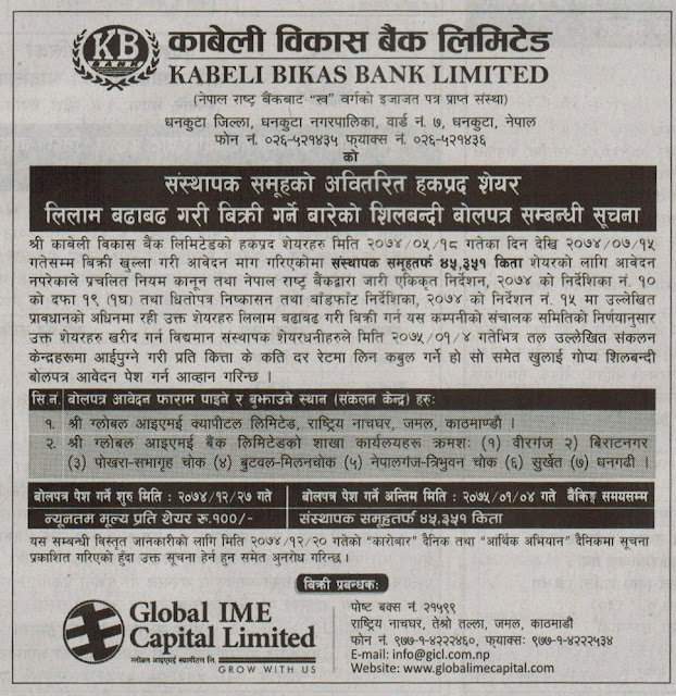 काबेलीको संस्थापक समुहको हकप्रद शेयर लीलामीमा अर्थ सरोकार २६ चैत्र २०७४, सोमबार पढ्न लाग्ने समय: १ मिनेटभन्दा कम ENG छुटाउनु भयो कि ? ‘यौन दुर्व्यवहार’को जाहेरी परेर थुनिएका कार्कीलाई एनआईसी एशियाले अझै हटाएन