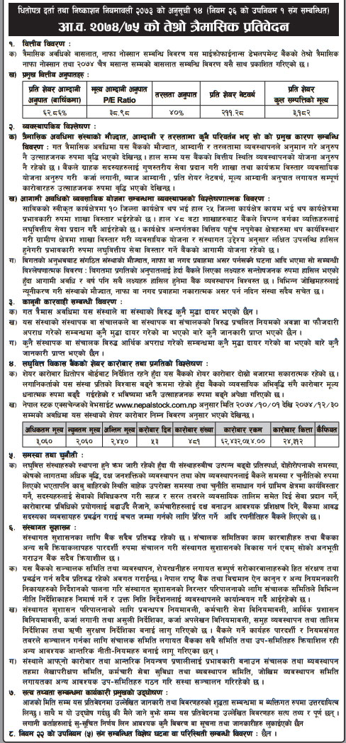 मिर्मिरे माइक्रोफाइनास् आर्थिक वर्ष २०७४/७५ को तेश्रो त्रैमासिकसम्मको बित्तिय विवरण अर्थ सरोकार १७ बैशाख २०७५, सोमबार पढ्न लाग्ने समय: १ मिनेटभन्दा कम ENG छुटाउनु भयो कि ? ‘यौन दुर्व्यवहार’को जाहेरी परेर थुनिएका कार्कीलाई एनआईसी एशियाले अझै हटाएन