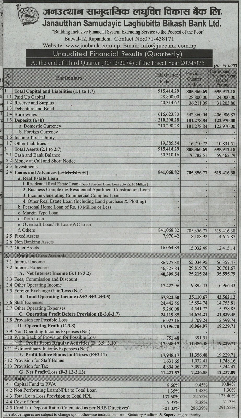 जनउत्थान सामुदायिक लघुवित्तको आर्थिक वर्ष २०७४/७५ को तेश्रो त्रैमासिकसम्मको बित्तिय विवरण अर्थ सरोकार ३१ बैशाख २०७५, सोमबार पढ्न लाग्ने समय: १ मिनेटभन्दा कम ENG छुटाउनु भयो कि ? ‘यौन दुर्व्यवहार’को जाहेरी परेर थुनिएका कार्कीलाई एनआईसी एशियाले अझै हटाएन
