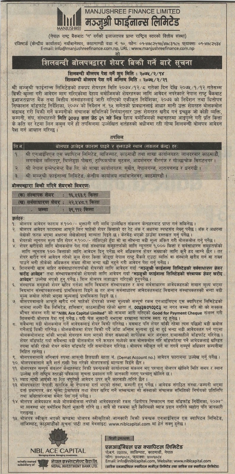 मन्जुश्री फाईनान्सको शिलबन्दी बोलपत्रद्वारा सेयर बिक्री गर्ने सूचना अर्थ सरोकार ७ जेष्ठ २०७५, सोमबार पढ्न लाग्ने समय: १ मिनेटभन्दा कम ENG छुटाउनु भयो कि ? ‘यौन दुर्व्यवहार’को जाहेरी परेर थुनिएका कार्कीलाई एनआईसी एशियाले अझै हटाएन