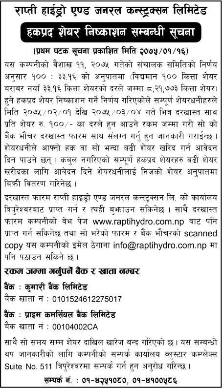 राप्ती हाईड्रोको हकप्रद सेयर निष्कासन सम्बन्धी सूचना अर्थ सरोकार १८ बैशाख २०७५, मंगलवार पढ्न लाग्ने समय: १ मिनेटभन्दा कम ENG छुटाउनु भयो कि ? ‘यौन दुर्व्यवहार’को जाहेरी परेर थुनिएका कार्कीलाई एनआईसी एशियाले अझै हटाएन