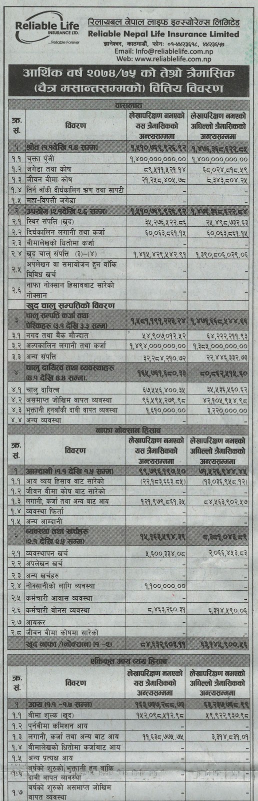रिलायबल नेपालको वर्ष २०७४/७५ को तेश्रो त्रैमासिकसम्मको बित्तिय विवरण अर्थ सरोकार ३० बैशाख २०७५, आईतवार पढ्न लाग्ने समय: १ मिनेटभन्दा कम ENG छुटाउनु भयो कि ? ‘यौन दुर्व्यवहार’को जाहेरी परेर थुनिएका कार्कीलाई एनआईसी एशियाले अझै हटाएन