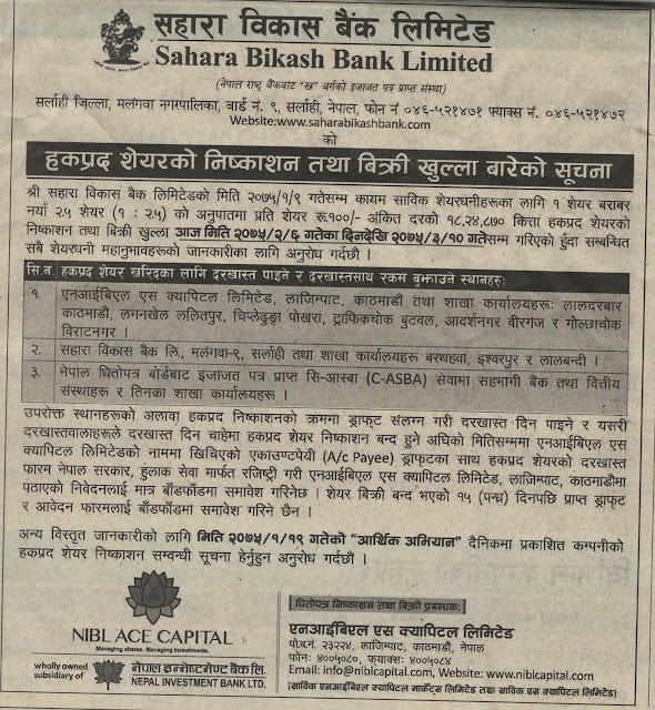 सहारा विकास बैंकको हकप्रद सेयरको निष्कासन तथा बिक्री खुल्ला बारेको सूचना अर्थ सरोकार ६ जेष्ठ २०७५, आईतवार पढ्न लाग्ने समय: १ मिनेटभन्दा कम ENG छुटाउनु भयो कि ? ‘यौन दुर्व्यवहार’को जाहेरी परेर थुनिएका कार्कीलाई एनआईसी एशियाले अझै हटाएन