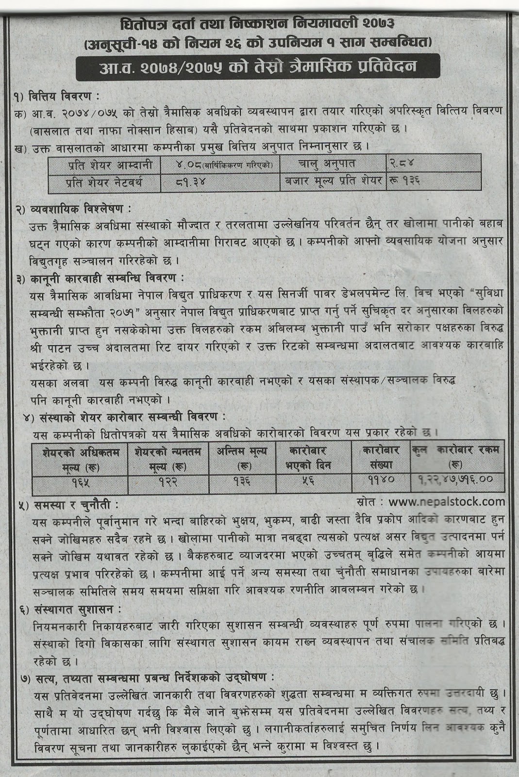 सिनर्जी पावरको आर्थिक वर्ष २०७४/७५ को तेश्रो त्रैमासिकसम्मको बित्तिय विवरण अर्थ सरोकार ३१ बैशाख २०७५, सोमबार पढ्न लाग्ने समय: १ मिनेटभन्दा कम ENG छुटाउनु भयो कि ? ‘यौन दुर्व्यवहार’को जाहेरी परेर थुनिएका कार्कीलाई एनआईसी एशियाले अझै हटाएन