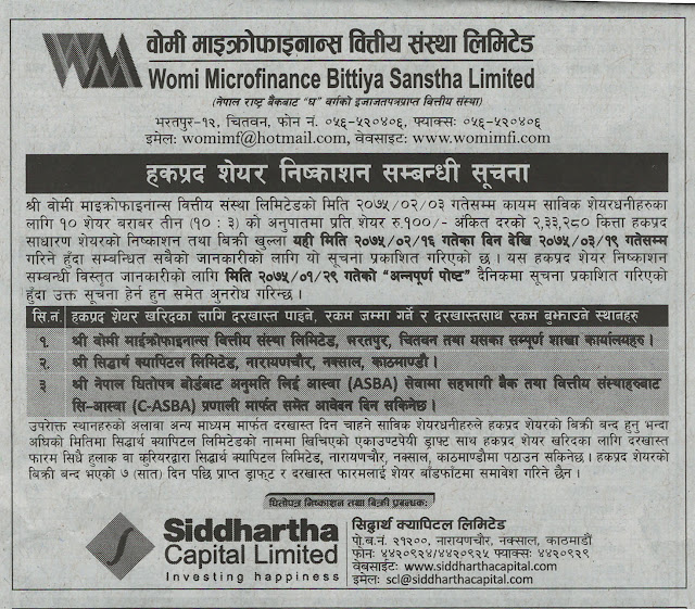वोमी माइक्रोफाइनान्सको हकप्रद सेयर निष्काशन सम्बन्धी सूचना अर्थ सरोकार ३० बैशाख २०७५, आईतवार पढ्न लाग्ने समय: १ मिनेटभन्दा कम ENG छुटाउनु भयो कि ? ‘यौन दुर्व्यवहार’को जाहेरी परेर थुनिएका कार्कीलाई एनआईसी एशियाले अझै हटाएन