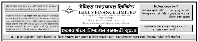जेबिल्स फाइनान्स लि.को हकप्रद सेयर निष्कासन सम्बन्धी सूचना अर्थ सरोकार २३ जेष्ठ २०७५, बुधबार पढ्न लाग्ने समय: १ मिनेटभन्दा कम ENG छुटाउनु भयो कि ? ‘यौन दुर्व्यवहार’को जाहेरी परेर थुनिएका कार्कीलाई एनआईसी एशियाले अझै हटाएन