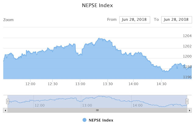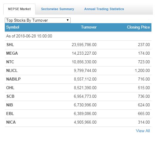 काठमाडौँ – साताको अन्तिम दिन बिहिबार बजार घटेको छ । बुधबारको तुलनामा बजार ०.८८ अंकले घटेर ११९८.५४ विन्दुमा आइपुगेको छ । कुल २४ करोड २९ लाख माथिको कारोबार भएको बजारमा सबैभन्दा बढी कारोबार एसएचएलले गरेको छ भने त्यसपछि क्रमश: मेगा र एनटिसीले गरेका छन् । कारोबारको संक्षिप्त विवरण तल हेर्नुहोस् :