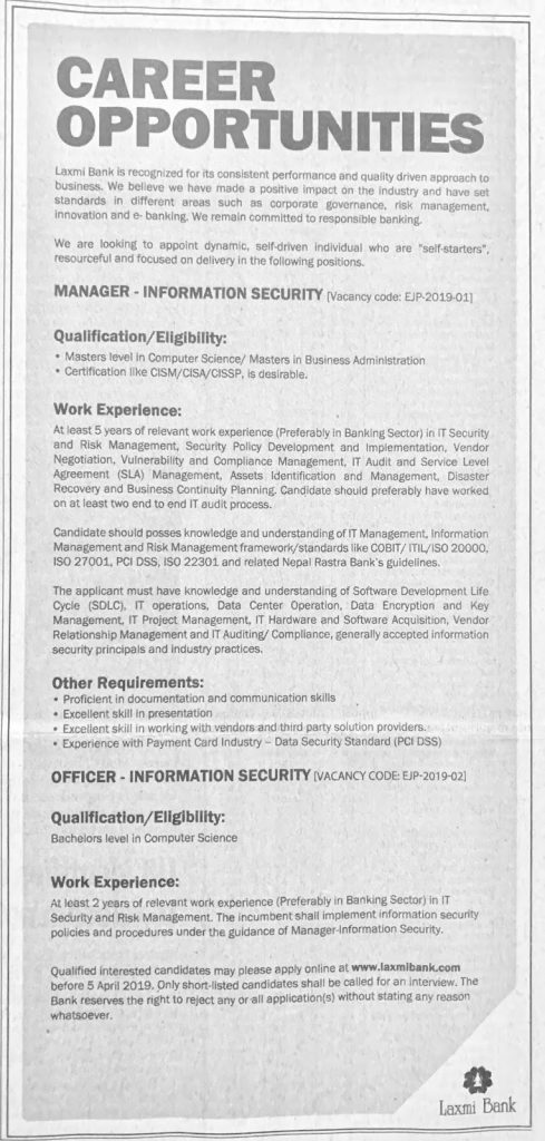 लक्ष्मी बैंकमा जागिरको अवसर, यस्ता छन् आवश्यक योग्यता र अनुभव (भ्याकेन्सी नोटिससहित) अर्थ सरोकार १५ चैत्र २०७५, शुक्रबार पढ्न लाग्ने समय: १ मिनेटभन्दा कम ENG काठमाडौँ – लक्ष्मी बैंक लि.मा जागिर खुल्ला भएको छ । बैंकले एक सार्बजनिक सूचना जारी गर्दै यस्तो जानकारी गराएको हो । बाकी तलको भ्याकेन्सी नोटिसमा हेर्नुहोस् : छुटाउनु भयो कि ? ‘यौन दुर्व्यवहार’को जाहेरी परेर थुनिएका कार्कीलाई एनआईसी एशियाले अझै हटाएन