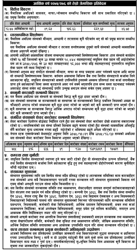 यो तेश्रो त्रैमाससम्ममा संस्थाको निक्षेप १४ करोड ५८ लाख ६४ हजार रुपैयाँ संकलन गरी कर्जा ४५ करोड ७३ लाख १३ हजार रुपैयाँ प्रवाह गरेको छ । संस्थाको चुक्ता पुँजी ६ करोड रुपैयाँ रहेको छ भने जगेडा कोषमा ५१ लाख ७५ हजार रुपैयाँ जम्मा भएको छ ।