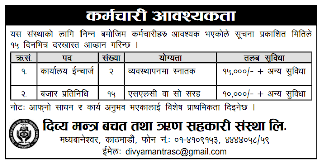 दिव्य मन्त्र बचत तथा ऋण सहकारी संस्थामा कर्मचारीको आवश्यकता, एसएलसी पास भएकाले पनि आवेदन दिन पाउने ! अर्थ सरोकार २२ बैशाख २०७६, आईतवार पढ्न लाग्ने समय: १ मिनेटभन्दा कम ENG काठमाडौँ – दिव्य मन्त्र बचत तथा ऋण सहकारी संस्था लिमिटेडमा जागिर खुल्ला भएको छ । संस्थाले आइतबार एक सार्वजनिक सूचना जारी गर्दै यस्तो जानकारी गराएको हो । बाँकी तलको भ्याकेन्सी नोटिसमा हेर्नुहोस् : छुटाउनु भयो कि ? ‘यौन दुर्व्यवहार’को जाहेरी परेर थुनिएका कार्कीलाई एनआईसी एशियाले अझै हटाएन