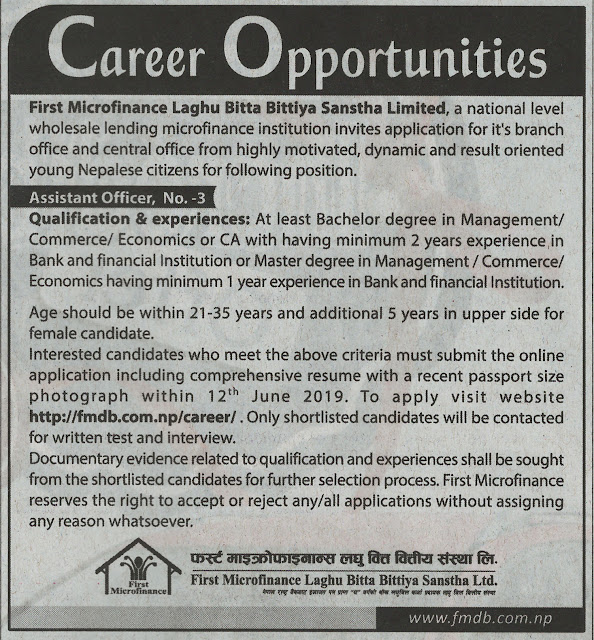 फर्स्ट माइक्रोफाइनान्समा जागिरको अवसर, पद असिस्टेन्ट अफिसर, यस्तो छ आवश्यक योग्यता र अनुभव अर्थ सरोकार १५ जेष्ठ २०७६, बुधबार पढ्न लाग्ने समय: १ मिनेटभन्दा कम ENG काठमाडौँ – फर्स्ट माइक्रोफाइनान्स लघु वित्त वित्तीय संस्थामा जागिर खुल्ला भएको छ । संस्थाले असिस्टेन्ट अफिसर पदका लागि कर्मचारी माग गरेको हो । ईच्छुक तथा योग्यता पुगेका नेपाली नागरिकले जेठ २९ गतेभित्र आवेदन दिईसक्नुपर्ने छ । छुटाउनु भयो कि ? ‘यौन दुर्व्यवहार’को जाहेरी परेर थुनिएका कार्कीलाई एनआईसी एशियाले अझै हटाएन