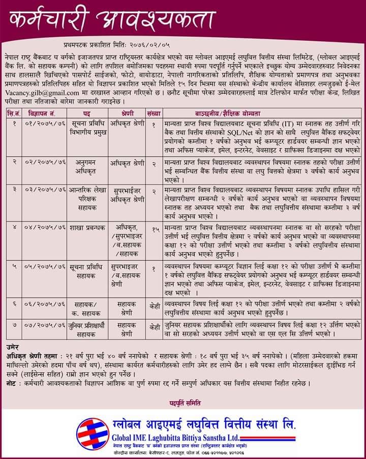 ग्लोबल आइएमई लघुवित्तमा ७ पदका लागि जागिर खुल्यो, यस्तो छ आवश्यक योग्यता र अनुभव (भ्याकेन्सी नोटिससहित) अर्थ सरोकार ६ जेष्ठ २०७६, सोमबार पढ्न लाग्ने समय: १ मिनेटभन्दा कम ENG काठमाडौँ – ग्लोबल आइएमई लघुवित्त वित्तीय संस्था लि. मा जागिर खुल्ला भएको छ । कम्पनीले एक सार्वजनिक सूचना जारी गर्दै यस्तो जानकारी गराएको हो । बाँकी तलको भ्याकेन्सी नोटिसमा हेर्नुहोस् : छुटाउनु भयो कि ? ‘यौन दुर्व्यवहार’को जाहेरी परेर थुनिएका कार्कीलाई एनआईसी एशियाले अझै हटाएन
