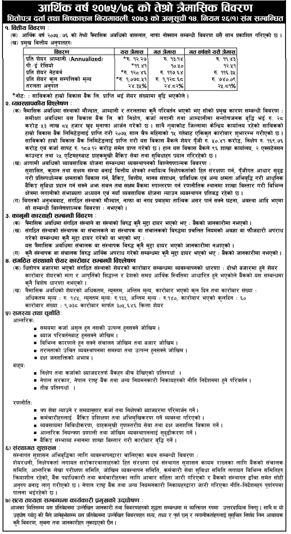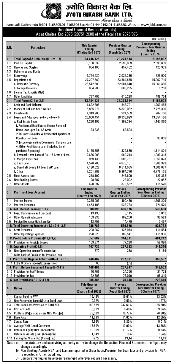 काठमाडौं – ज्योति विकास बैंकले आर्थिक वर्ष २०७५/७६ को तेस्रो त्रैमासको वित्तीय विवरण सार्वजनिक गरेको छ । सार्वजनिक गरेको विवरण अनुसार बैंकले खुद नाफा २८.३१% ले बढेर २८ करोड ५३ लाख ८५ हजार रुपैयाँ कमाएको छ । गत वर्ष यहि अवधिमा बैंकले २२ करोड २४ लाख १० हजार रुपैयाँ मात्र खुद नाफा कमाएको थियो ।