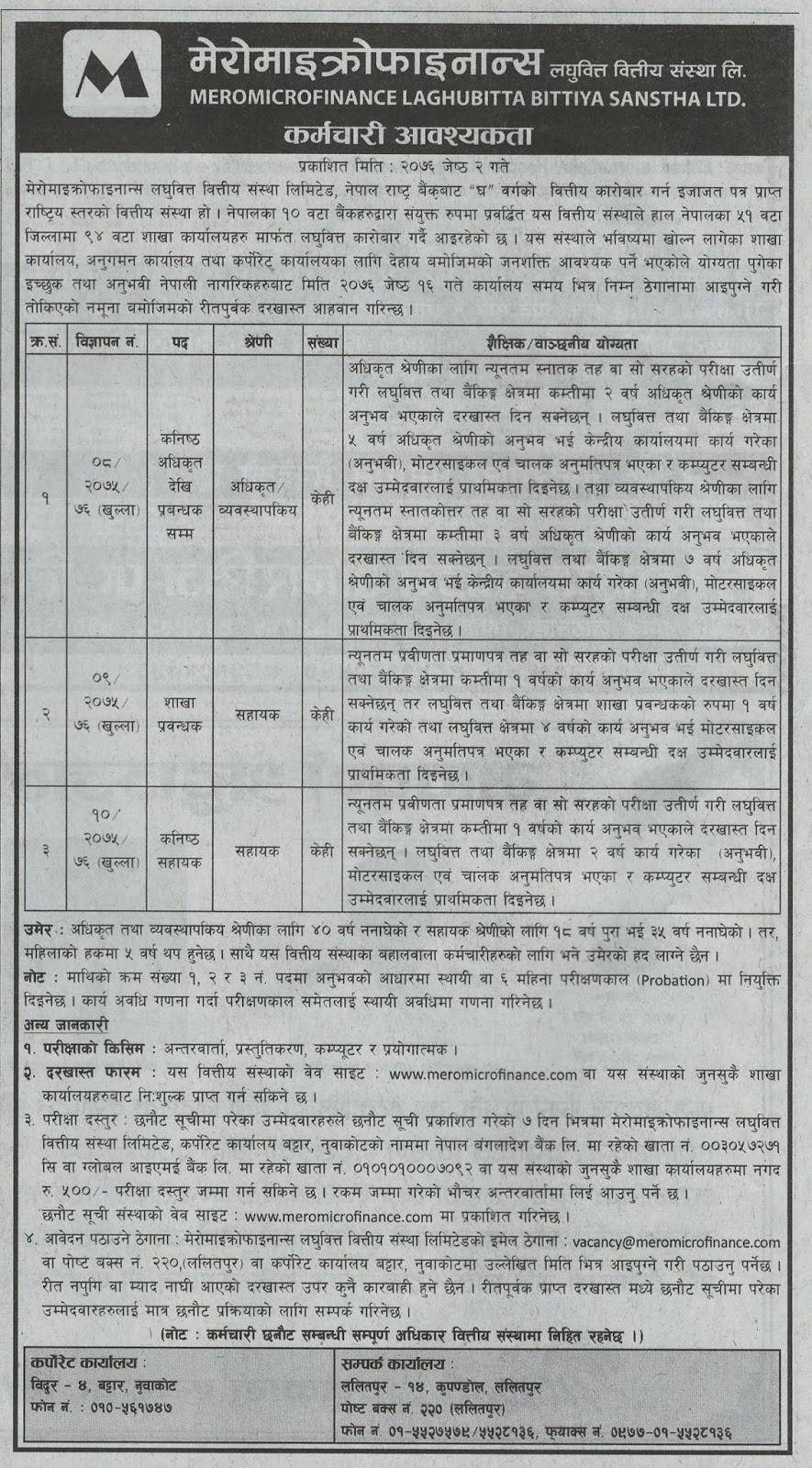 मेरो माइक्रोफाइनान्स लघुवित्तमा रोजगारीको अवसर, यस्तो छ आवश्यक योग्यता र अनुभव (भ्याकेन्सी नोटिससहित) अर्थ सरोकार २ जेष्ठ २०७६, बिहीबार पढ्न लाग्ने समय: १ मिनेटभन्दा कम ENG काठमाडौँ – मेरो माइक्रोफाइनान्स लघुवित्त वित्तीय संस्था लि. मा विभिन्न पदका लागि जागिर खुल्ला भएको छ । संस्थाले बिहिबार एक सार्वजनिक सूचना जारी गर्दै यस्तो जानकारी गराएको हो । बाँकी तलको भ्याकेन्सी नोटिसमा हेर्नुहोस् : छुटाउनु भयो कि ? ‘यौन दुर्व्यवहार’को जाहेरी परेर थुनिएका कार्कीलाई एनआईसी एशियाले अझै हटाएन