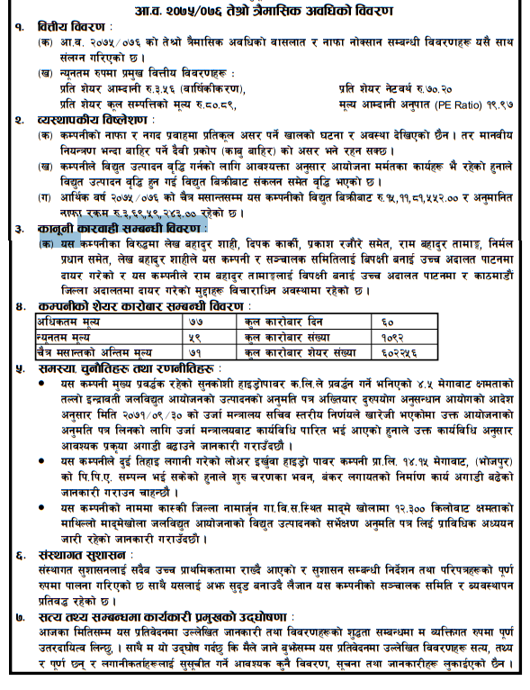 कम्पनीको प्रतिसेयर आम्दानी गत वर्षको तुलनामा घटेर ३ रुपैयाँ ५६ पैसामा सीमित भएको छ । गत वर्ष यसको प्रतिसेयर आम्दानी ६ रुपैयाँ ८८ पैसा रहेको थियो । यता, नेसनलले विद्युत बिक्रीबाट ३ करोड ४३ लाख ५७ हजार रुपैयाँ आम्दानी गरेको छ । यो गत वर्षको भन्दा १५.९०% बढी हो ।