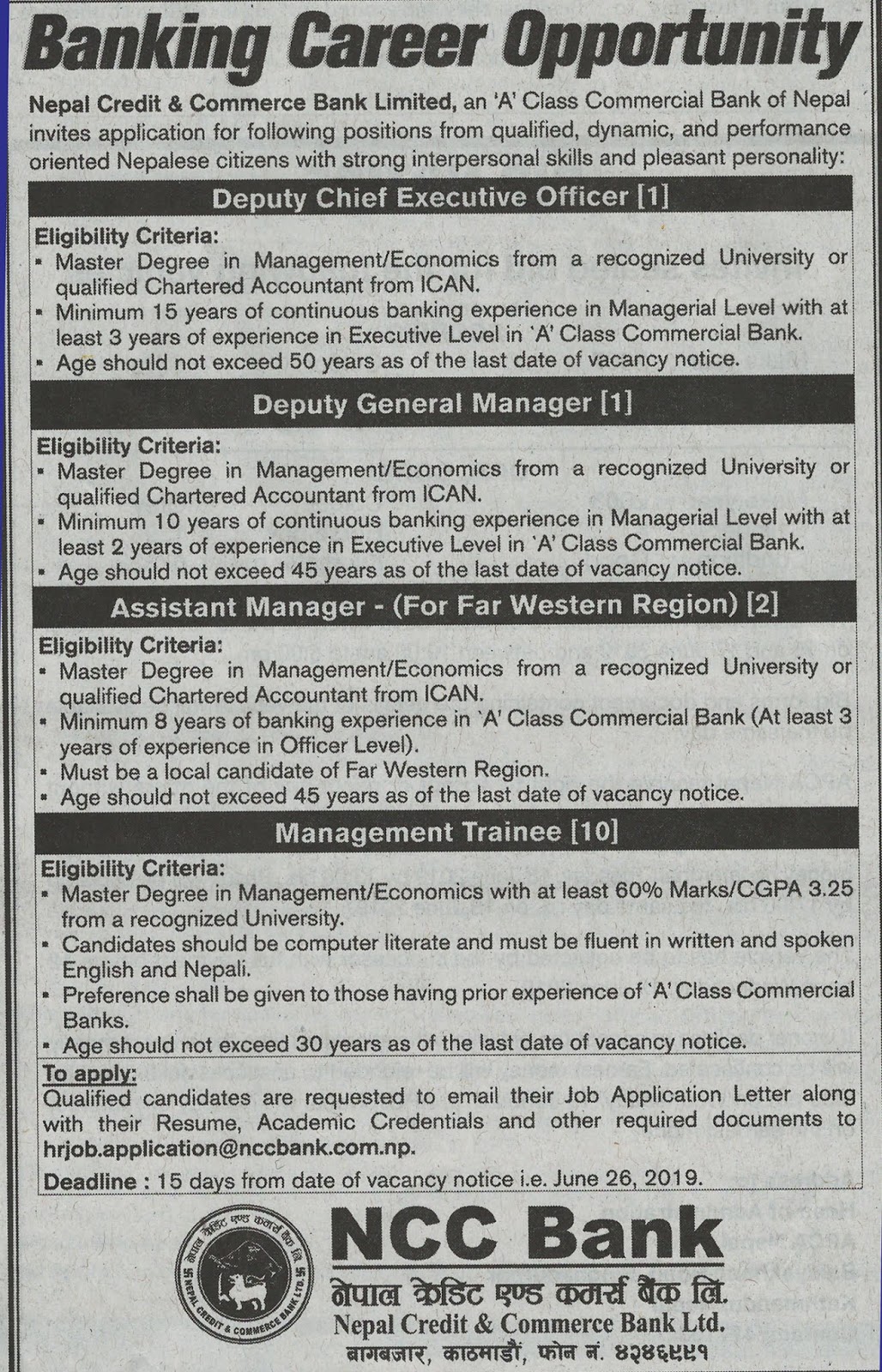 एनसिसि बैंकमा ४ पदका लागि जागिर खुल्यो, यस्तो छ आवश्यक योग्यता र अनुभव (भ्याकेन्सी नोटिससहित) अर्थ सरोकार २९ जेष्ठ २०७६, बुधबार पढ्न लाग्ने समय: १ मिनेटभन्दा कम ENG काठमाडौँ – नेपाल क्रेडिट एण्ड कमर्स बैंक (एनसिसि) लिमिटेडमा जागिर खुल्ला भएको छ । बैंकले विभिन्न पदका लागि कर्मचारी माग गरेको हो । इच्छुक तथा योग्यता पुगेका उम्मेदवारले यो सूचना प्रकाशित भएको मितिले १५ दिन भित्र आवेदन दिन सक्नेछन् । छुटाउनु भयो कि ? ‘यौन दुर्व्यवहार’को जाहेरी परेर थुनिएका कार्कीलाई एनआईसी एशियाले अझै हटाएन