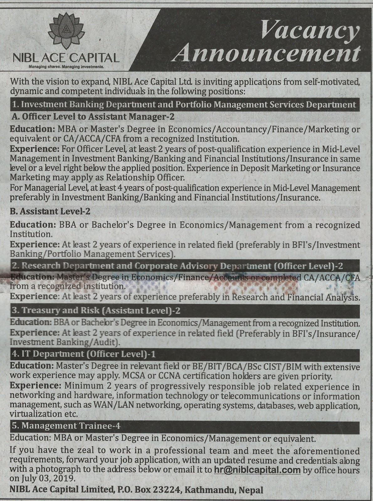 एनआईबिएल एस क्यापिटलमा ५ पदका लागि जागिर खुल्यो, यस्तो छ आवश्यक योग्यता र अनुभव (भ्याकेन्सी नोटिससहित) अर्थ सरोकार ४ असार २०७६, बुधबार पढ्न लाग्ने समय: १ मिनेटभन्दा कम ENG काठमाडौं – एनआईबिएल एस क्यापिटलमा विभिन्न पदका लागि कर्मचारी मागेको छ । बैंक बुधबार एक सार्वजनिक सूचना जारी गर्दै यस्तो जानकारी गराएको हो । बाँकी तलको भ्याकेन्सी नोटिसमा हेर्नुहोस् : छुटाउनु भयो कि ? ‘यौन दुर्व्यवहार’को जाहेरी परेर थुनिएका कार्कीलाई एनआईसी एशियाले अझै हटाएन
