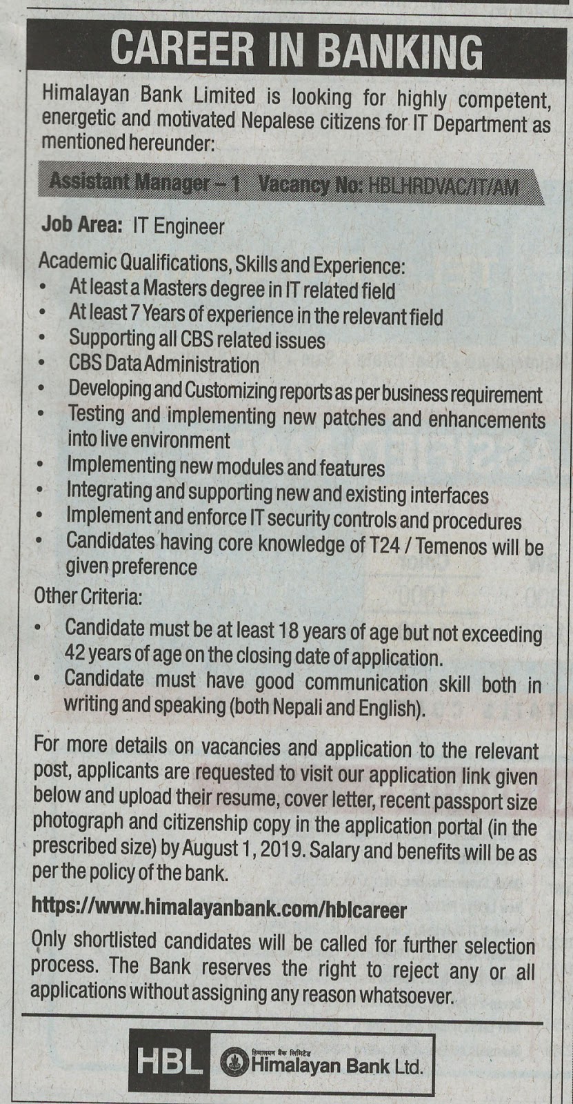 हिमालयन बैंकमा रोजगारीको अवसर, यस्तो छ आवश्यक योग्यता र अनुभव (भ्याकेन्सी नोटिससहित) अर्थ सरोकार ८ श्रावण २०७६, बुधबार पढ्न लाग्ने समय: १ मिनेटभन्दा कम ENG काठमाडौँ – हिमालयन बैंकमा जागिर खुल्ला भएको छ । बैंकले बुधबार एक सार्वजनिक सूचना जारी गर्दै यस्तो जानकारी गराएको हो । बाँकी तलको भ्याकेन्सी नोटिसमा हेर्नुहोस् : छुटाउनु भयो कि ? ‘यौन दुर्व्यवहार’को जाहेरी परेर थुनिएका कार्कीलाई एनआईसी एशियाले अझै हटाएन