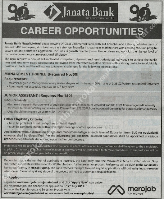 बैंकमा रोजगारीको सुवर्ण अवसर, जनता बैंकले माग्यो २०० जना कर्मचारी (भ्याकेन्सी नोटिससहित) अर्थ सरोकार १८ असार २०७६, बुधबार पढ्न लाग्ने समय: १ मिनेटभन्दा कम ENG काठमाडौँ – जनता बैंकले विभिन्न पदका लागि कर्मचारी माग गरेको छ । बैंकले म्यानेजमेन्ट ट्रेनीका लागि ५० जना र जुनियर असिस्टेन्टका लागि १५० जना कर्मचारी माग गरेको छ । ईच्छुक तथा योग्यता पुगेका नेपाली नागरिकले जुलाई १७ सम्म आवेदन दिन सक्नेछन् । छुटाउनु भयो कि ? ‘यौन दुर्व्यवहार’को जाहेरी परेर थुनिएका कार्कीलाई एनआईसी एशियाले अझै हटाएन