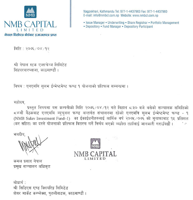 एनएमबि सुलभ ईन्भेष्टमेन्ट फण्ड-१ ले गर्यो १५% नगद लाभांश दिने घोषणा अर्थ सरोकार १२ श्रावण २०७६, आईतवार पढ्न लाग्ने समय: १ मिनेटभन्दा कम ENG काठमाडौं – एनएमबि सुलभ ईन्भेष्टमेन्ट फण्ड-१ ले १५% नगद लाभांश दिने भएको छ । योजना व्यवस्थापक एनएमबि क्यापिटलको आइतबार बसेको सञ्चालक समितिको ८४औँ बैठकले आर्थिक वर्ष २०७५/७६ को मुनाफाबाट कर सहित १५% नगद लाभांश दिने निर्णय गरेको हो । छुटाउनु भयो कि ? ‘यौन दुर्व्यवहार’को जाहेरी परेर थुनिएका कार्कीलाई एनआईसी एशियाले अझै हटाएन