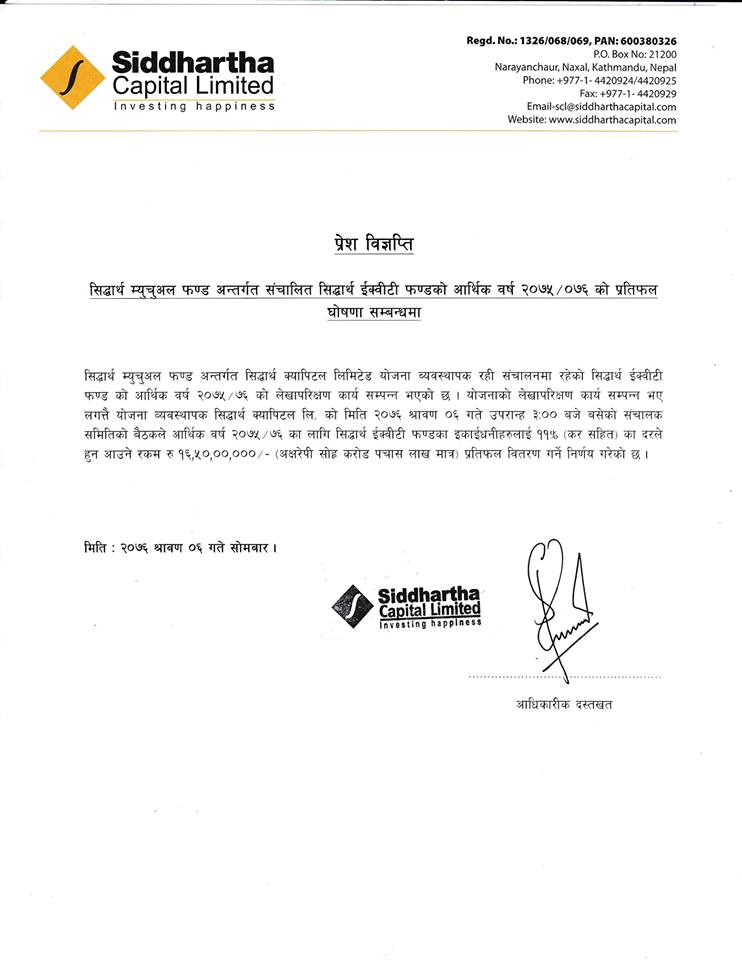 काठमाडौं – सिद्धार्थ इक्विटी फन्डले ११% नगद लाभांश दिने घोषणा गरेको छ । योजना व्यवस्थापक सिद्धार्थ क्यापिटलको सोमबार बसेको सञ्चालक समिति बैठकले आर्थिक वर्ष २०७५–७६ को नाफाबाट इकाईधनीलाई करसहित ११% नगद लाभांश वितरण गर्ने निर्णय गरेको हो । नगद लाभांश वितरणमा यसले १६ करोड ५० लाख रुपैयाँ खर्च गर्नेछ ।