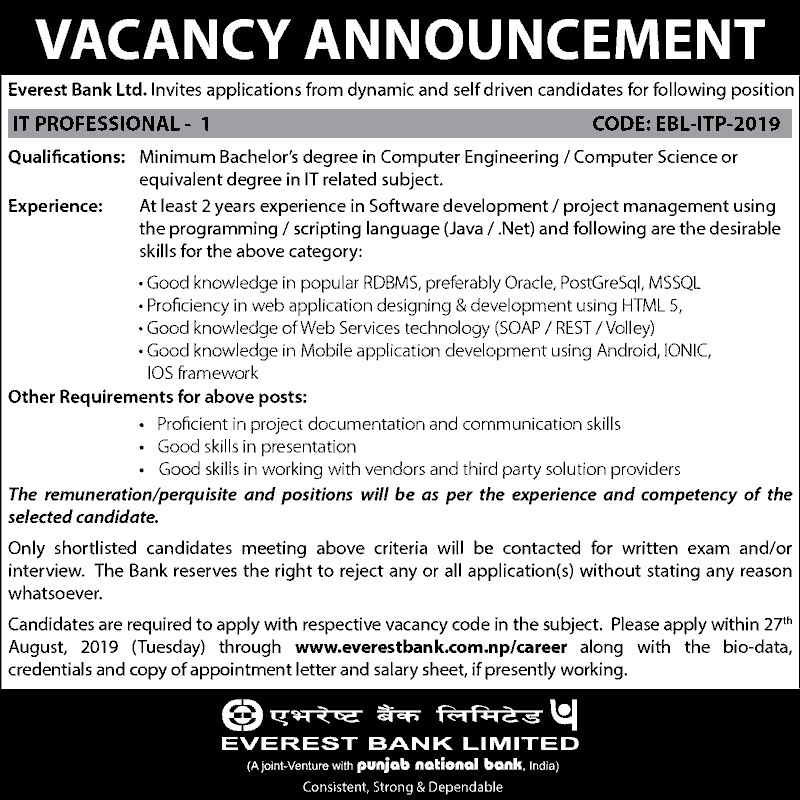 एभरेष्ट बैंकमा रोजगारीको अवसर, यस्तो छ आवश्यक योग्यता र अनुभव (भ्याकेन्सी नोटिससहित) अर्थ सरोकार ३ भाद्र २०७६, मंगलवार पढ्न लाग्ने समय: १ मिनेटभन्दा कम ENG काठमाडौँ – एभरेष्ट बैंकमा जागिर खुल्ला भएको छ । बैंकले मंगलबार एक सार्वजनिक सूचना जारी गर्दै यस्तो जानकारी गराएको हो । बाँकी तलको भ्याकेन्सी नोटिसमा हेर्नुहोस् : छुटाउनु भयो कि ? ‘यौन दुर्व्यवहार’को जाहेरी परेर थुनिएका कार्कीलाई एनआईसी एशियाले अझै हटाएन