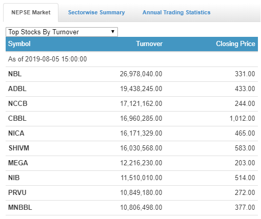 काठमाडौँ – साताको कारोबार दोस्रो दिन सोमबार बजार घटेको छ । आइतबारको तुलनामा बजार ५.९८ अंकले घटेर १२५३.६६ विन्दुमा आइपुगेको छ । कुल ४४ करोड ३२ लाख माथिको कारोबार भएको बजारमा सबैभन्दा बढी कारोबार एनबिएलले गरेको छ भने त्यसपछि क्रमश: एडीबीएलर एनसीसीबिले गरेका छन् । कारोबारको संक्षिप्त विवरण तल हेर्नुहोस् : हेर्नुहोस् आज बढी कारोबार भएका कम्पनीहरुको विवरण :
