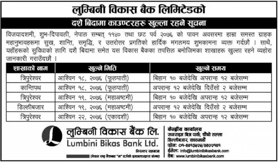 लुम्बिनी विकास बैंकका यी शाखा दशैँ विदामा पनि खुल्ने !