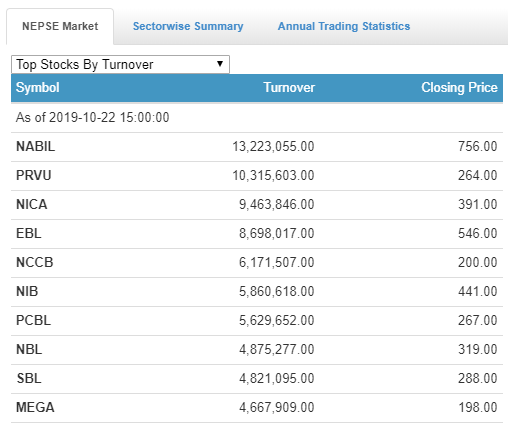 काठमाडौँ – साताको कारोबारको अन्तिम दिन मंगलबार बजार बढेको छ । सोमबारको तुलनामा बजार २.४० अंकले बढेर ११३४.७९ विन्दुमा आइपुगेको छ । कुल १६ करोड ५२ लाख माथिको कारोबार भएको बजारमा सबैभन्दा बढी कारोबार नबिलले गरेको छ भने त्यसपछि क्रमश: पिआरभियु र एनआईसीएले गरेका छन् । कारोबारको संक्षिप्त विवरण तल हेर्नुहोस् :